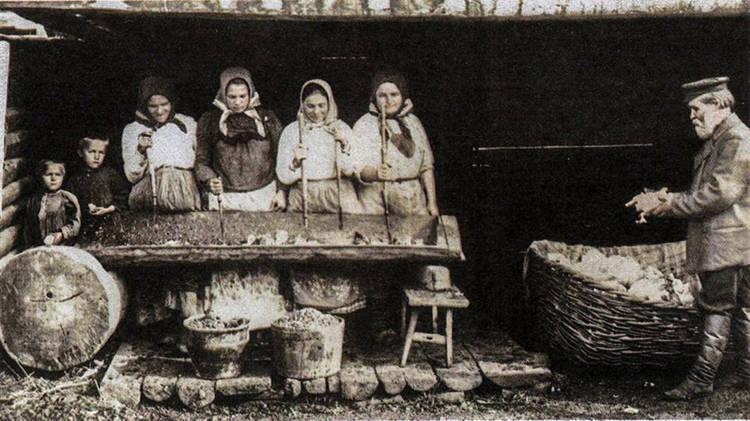 На фотографии изображены два любопытных мальчика в традиционных рубахах, внимательно наблюдающие за происходящим. Позади них – их мать, которая, обняв детей, словно охраняет их от шалостей, наполняет пространство заботой и теплом. Две женщины в платках рассуждают о процессе, оценивая работу с сосредоточенными лицами, которые говорят о долгих часах за столом.