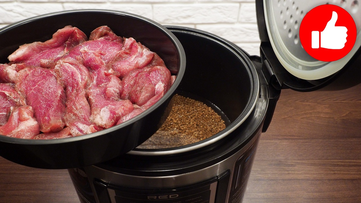2. В чашу мультиварки добавьте предварительно промытую гречневую крупу, соль и холодную воду. Поверх гречки установите корзину с мясом.