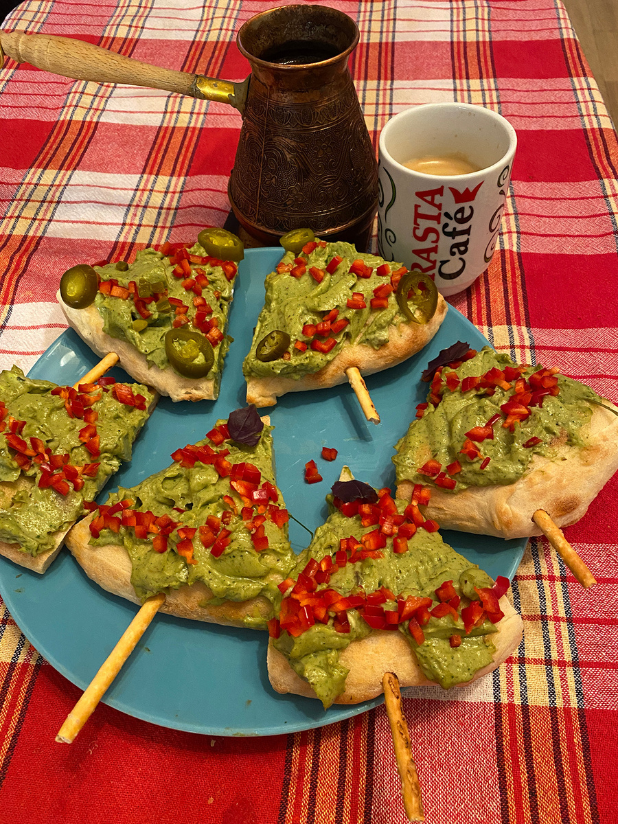 После этого, полученную пасту равномерно распределяем на лаваш. Помидор или перец нарезаем маленькими кубиками и раскладываем их на закуску, дополняя нарезанным базиликом и мелко порубленным укропом для изысканного внешнего вида. Если хочется немного остроты, в блюдо можно добавить и кусочки халапеньо.
