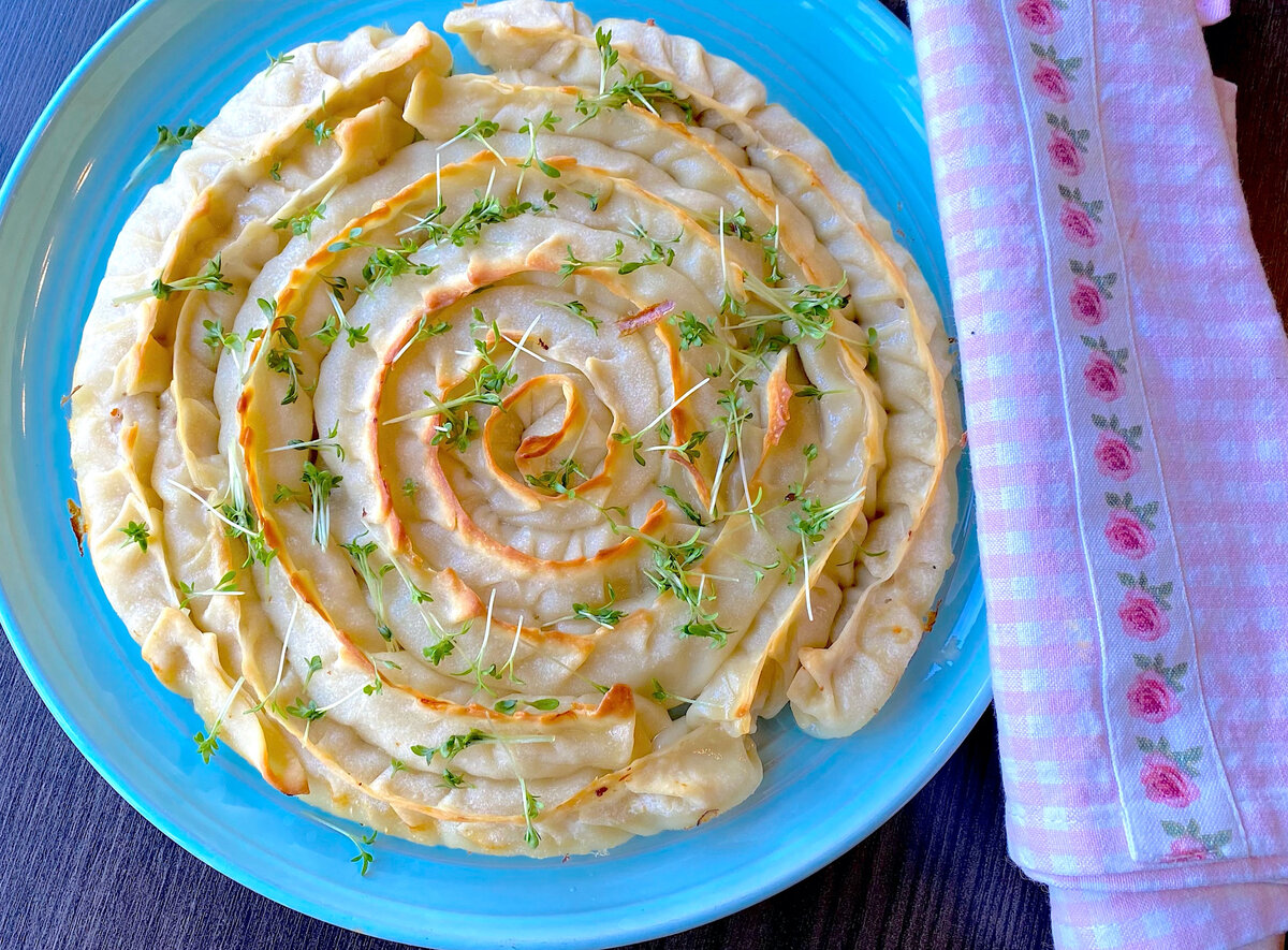 В центре блюда — тесто для пельменей и мантов, которое активно используется в этом рецепте. Приготовление теста занимает всего несколько минут: