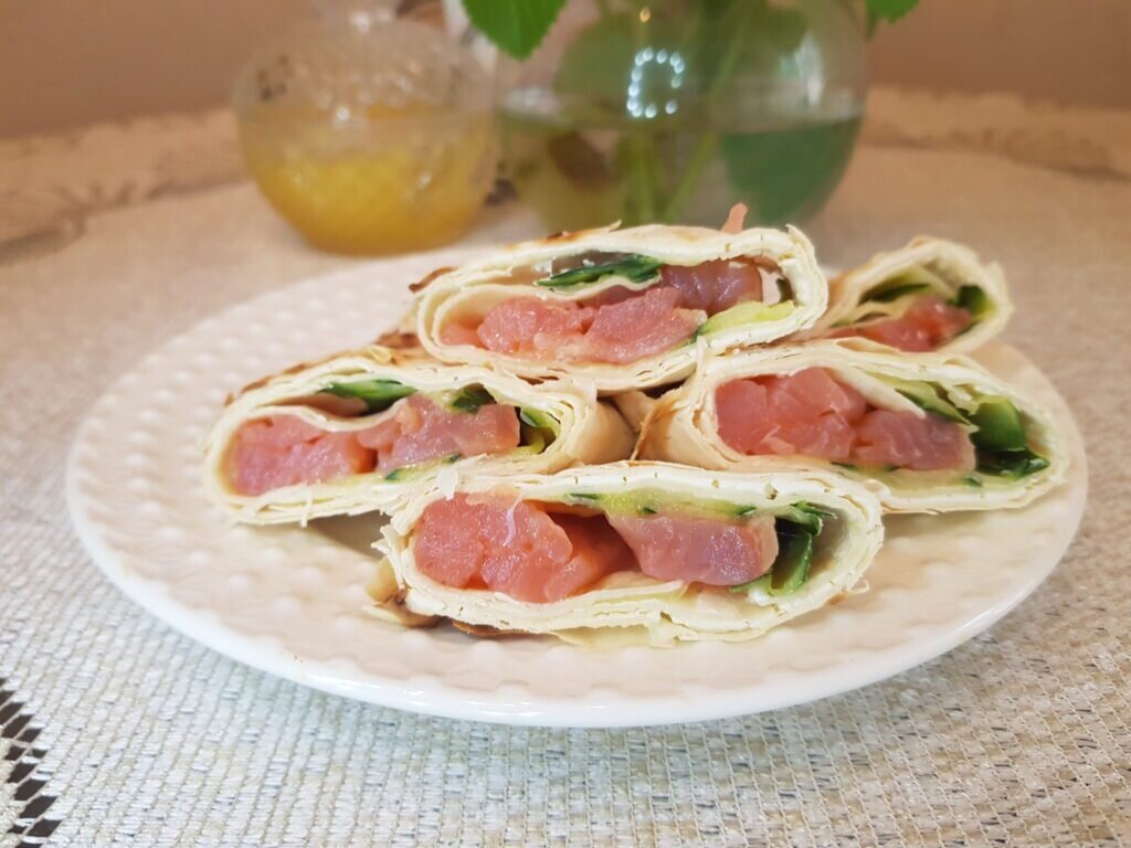 Аккуратно скатайте лаваш в рулет и поместите в холодильник на один час, чтобы ингредиенты как следует пропитались. Можно также нарезать его и сразу же подавать к столу!