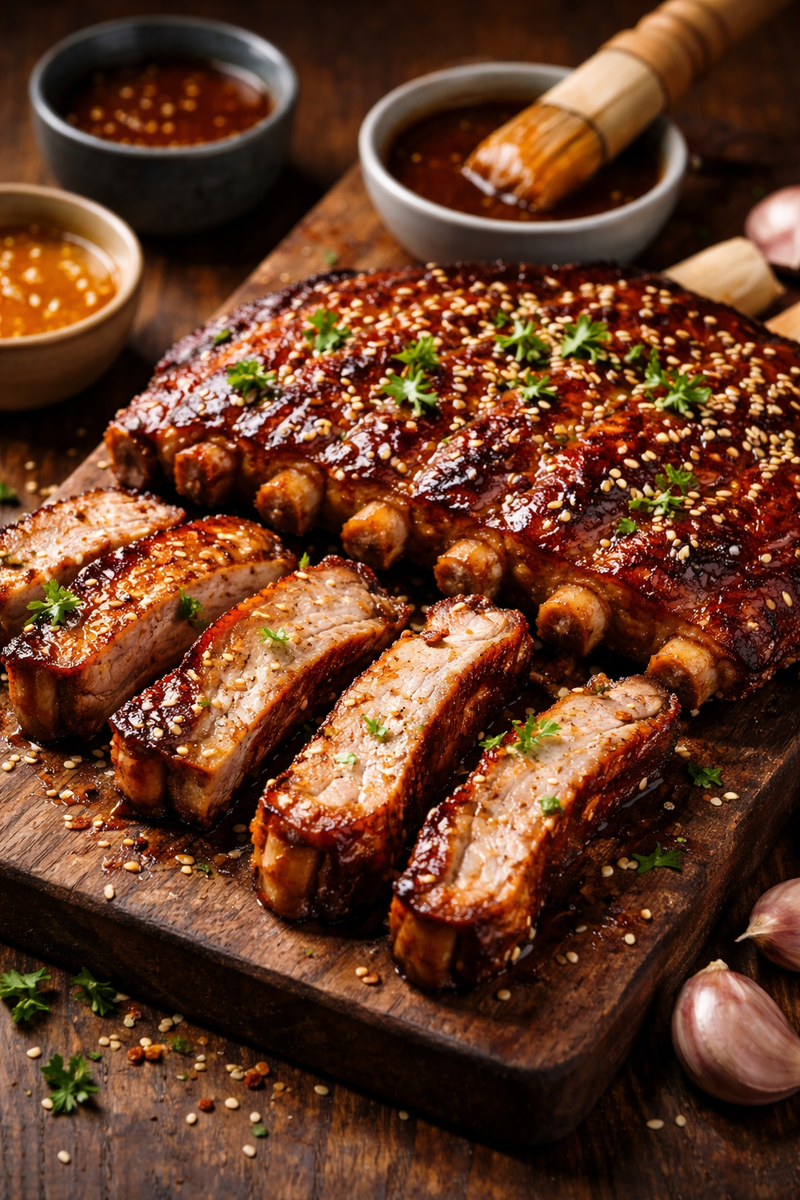 Свиные ребра требуют времени и терпения, и именно это делает их особенными. Идеально их запекать в духовке, когда дом наполняется волшебными ароматами меда и специй. Глазурь, хоть на первый взгляд и кажется слишком сладкой, в процессе приготовления превращается в насыщенный соус благодаря балансировке с солью и кислотой.