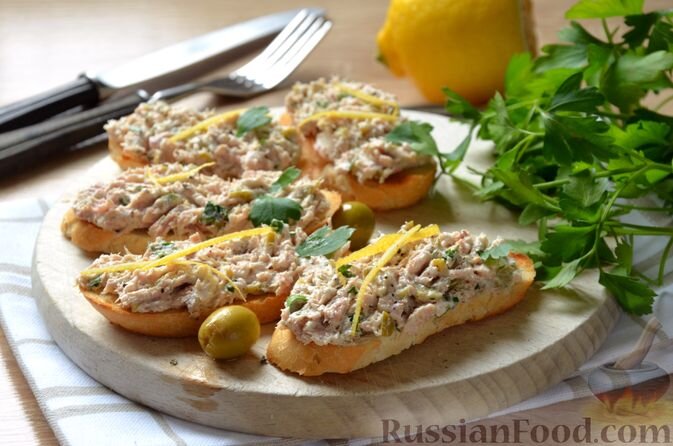- Закуска с тунцом и оливками — ещё один отличный вариант. Консервированный тунец в сочетании с мягким сливочным сыром, лимонной цедрой и зеленью придаёт изысканный вкус на хрустящих ломтиках багета.