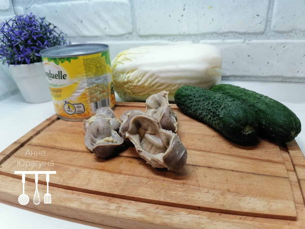 Первым этапом необходимо отварить желудочки в подсоленной воде, а затем нарезать их на небольшие кусочки. Свежий огурец также нарезается кубиками.