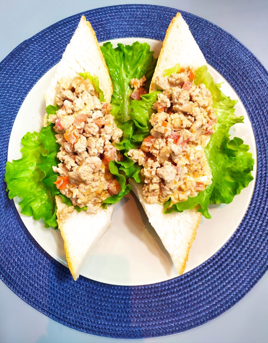 Теперь пришло время собрать всё воедино: нарежьте багет на длинные куски, разрежьте вдоль, положите внутрь листья салата. Сверху выложите индейку с соусом — и завтрак готов к подаче!