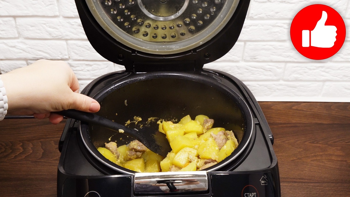 Далее в массу вводятся специи, сметана, горячая вода и нарезанный картофель. Все тщательно перемешивается. Блюдо тушится в режиме «Тушение» в течение 50 минут.