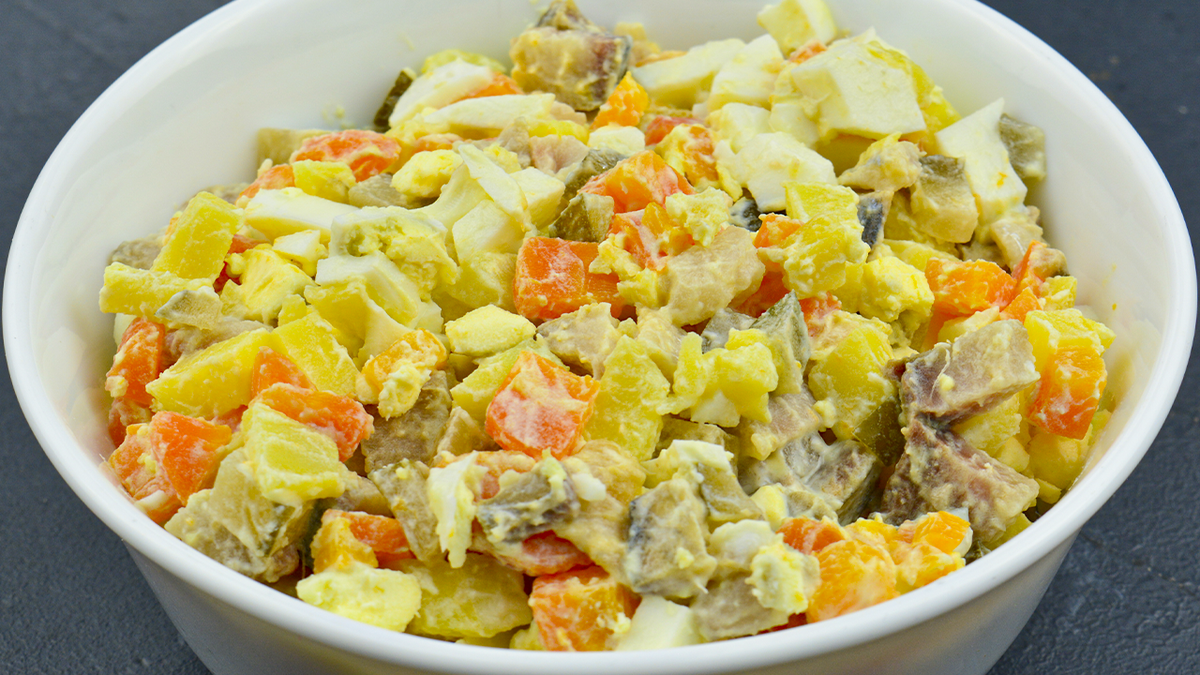Смешать все компоненты в глубоком салатнике и заправить майонезом. Поскольку в салате уже присутствуют соленые огурцы и селедка, добавление соли может оказаться излишним — это зависит от ваших предпочтений.