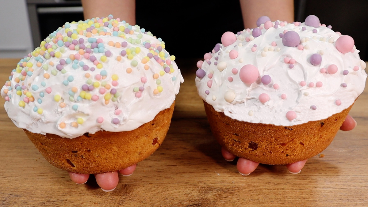6. Остывшие куличи украсьте глазурью и добавьте декор по вкусу. Лучшие варианты: цветная посыпка, маршмеллоу или цукаты!