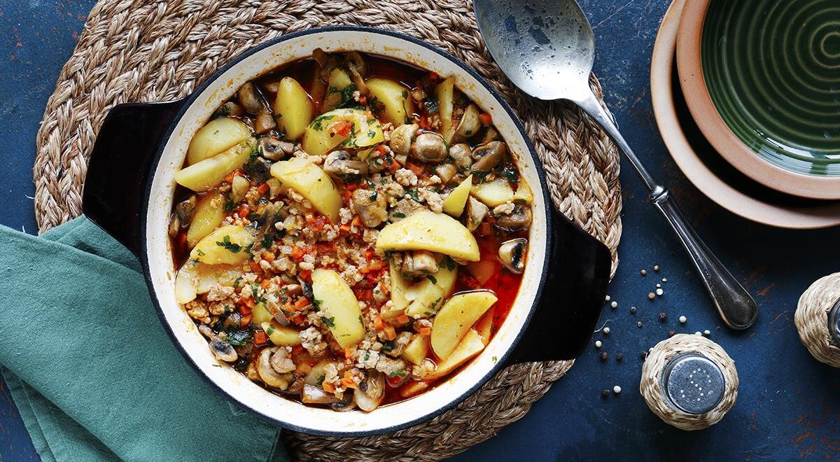 Картошка с фаршем и грибами — это не просто симпатичное название, но и отличное решение для быстрого и сытного ужина. Этот простой рецепт можно смело охарактеризовать как домашнее «блюдо в стиле болоньезе». Не стесняйтесь экспериментировать с фаршем: свинина, говядина, курица или даже кролик прекрасно подойдут для этого блюда.
