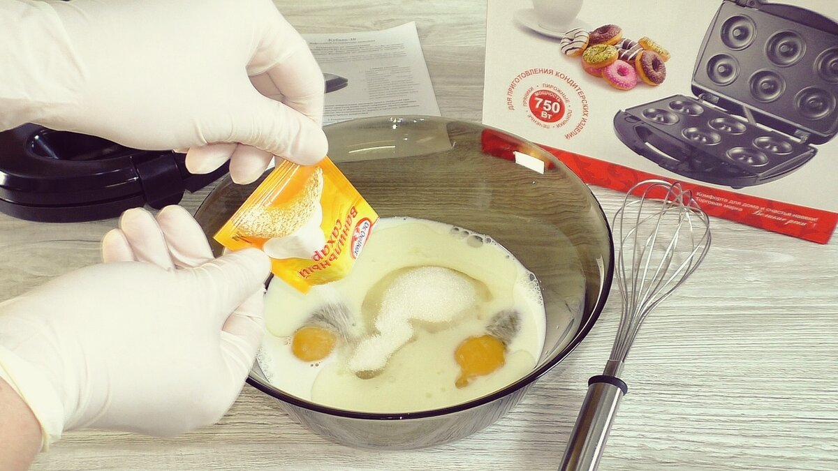 Чтобы испечь пончики, воспользуйтесь электровафельницей с панелями для пончиков. Установите нужные панели, закройте прибор и подключите его к сети. Когда загорится зелёный индикатор, значит, вафельница готова к использованию. Выпекайте пончики в течение 5-7 минут. Они получаются легкими и воздушными.