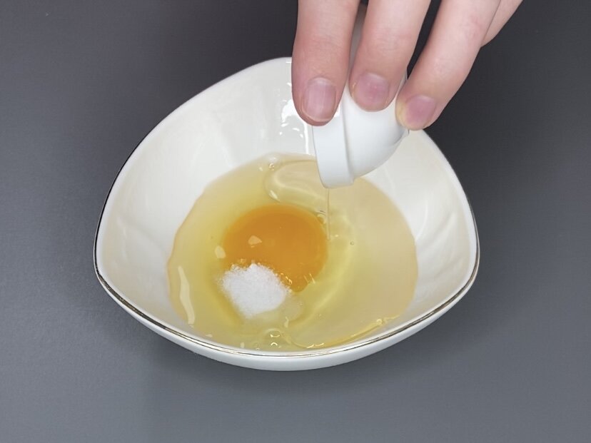 - Взбейте одно яйцо с щепоткой соли и тремя столовыми ложками растительного масла без запаха.