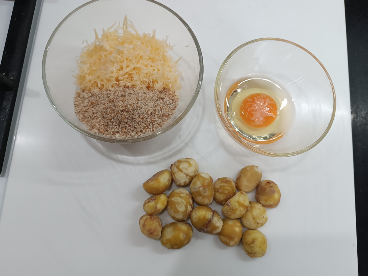 Следующий шаг — натереть сыр на мелкой терке и объединить его с панировочными сухарями. В отдельной миске взболтать яйцо с щепоткой соли, чтобы получить однородную массу для обмакивания каштанов.