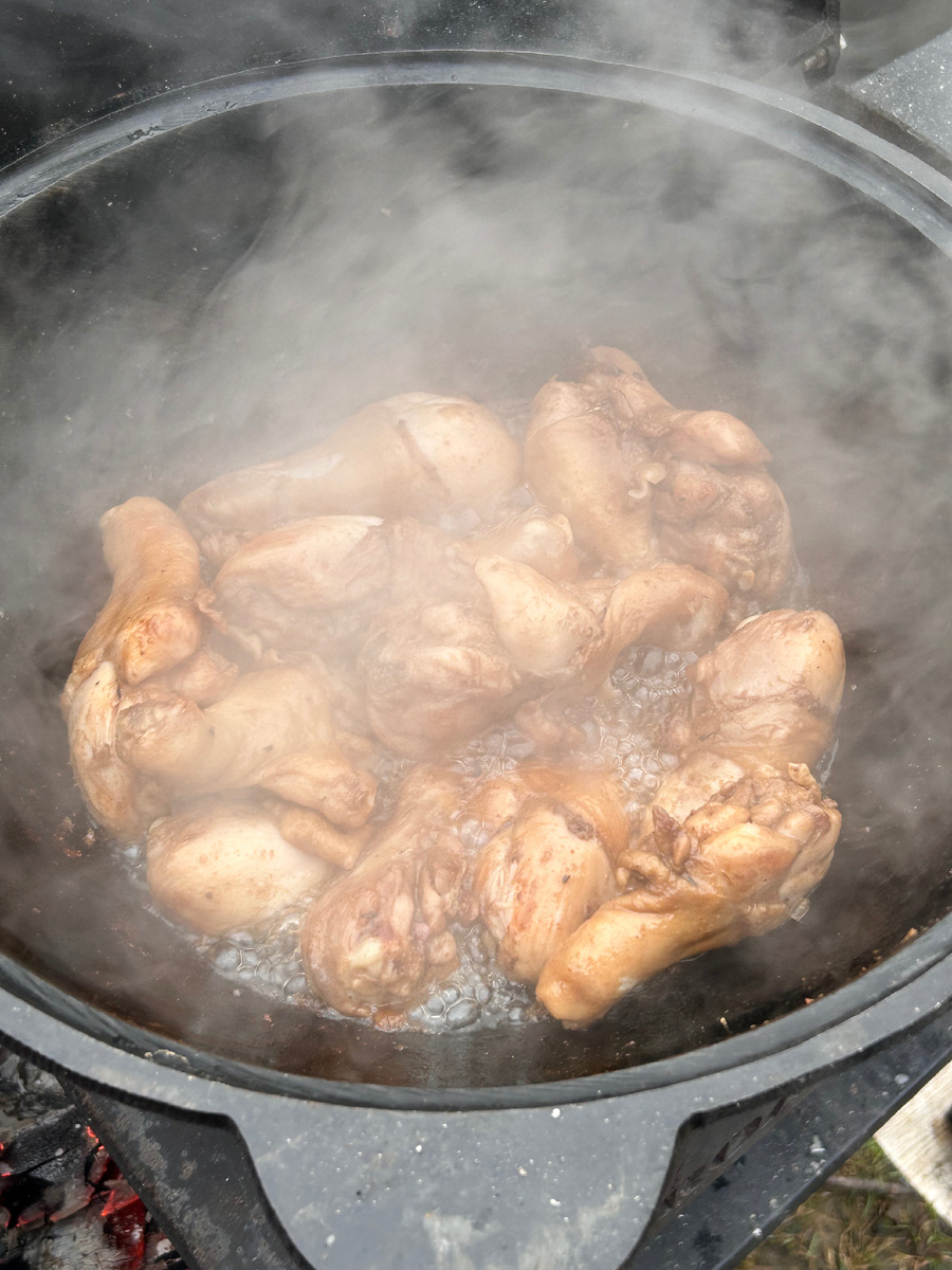 Картошку нарезаем на четвертинки, а лук и морковь — по желанию, не слишком мелко. В казане разогреваем масло и обжариваем куриные голени до золотистой корочки. После этого перемещаем их в отдельную посуду.