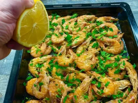 6. Подача — после запекания посыпьте готовые креветки свежей петрушкой и сбрызните лимонным соком для акцента.
