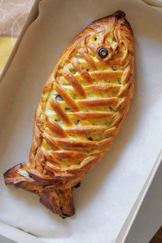 Придайте кулебяке красивые детали, формируя глаз из оставшегося теста и оливки.