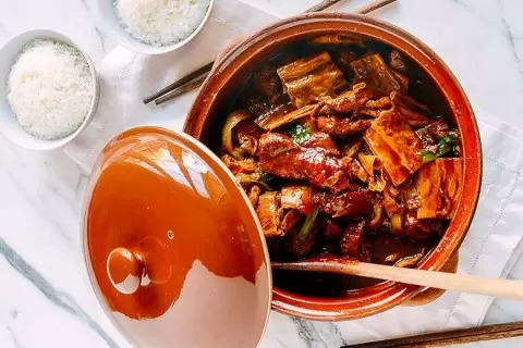 - После этого влить шаосинское вино, соусы хойсин и соевый, добавить устричный соус, кунжутное масло и перец. Влить воду и довести до кипения, после чего убавить огонь и тушить 1 час, периодически помешивая.