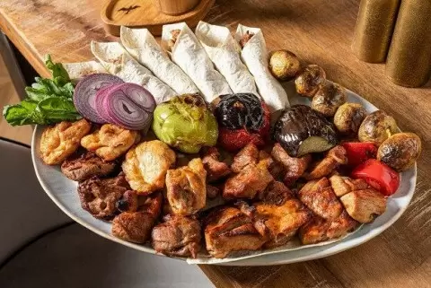• Подавайте шашлык на красивой тарелке вместе с кольцами лука, запеченными помидорами, свежим салатом цицмат и восхитительным соусом сацебели.
