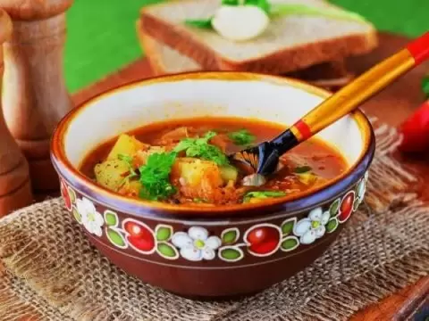 Как только картофель сварится, добавить к бульону тушеные овощи, тщательно перемешать, довести до кипения и попробовать на кислоту и соль, регулируя вкус по желанию. Для дополнительной кислинки можно добавить немного рассола.