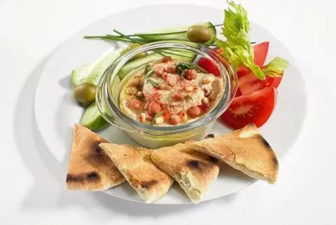 • Перед подачей хумус посыпается щепоткой кайенского перца и мелко нарезанной зеленью. К этому блюду прекрасно подойдут пита, оливки, помидоры, огурцы и прочие овощи для макания.