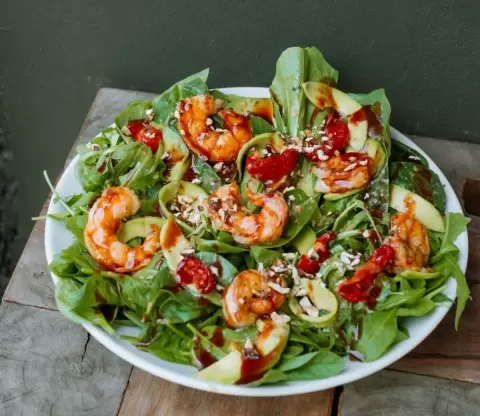 Салат радует не только размером, но и вкусовым разнообразием: хрустящий пак-чой, упругие шиитаки и сладковатые вяленые помидоры сливаются воедино с насыщенной текстурой крупных креветок. Заправка, состоящая из орехового гамадари и цитрусового понзу, добавляет неожиданные нотки, делая это блюдо настоящим открытием. Такой салат придаст яркие краски даже самой обычной трапезе, особенно в праздники!