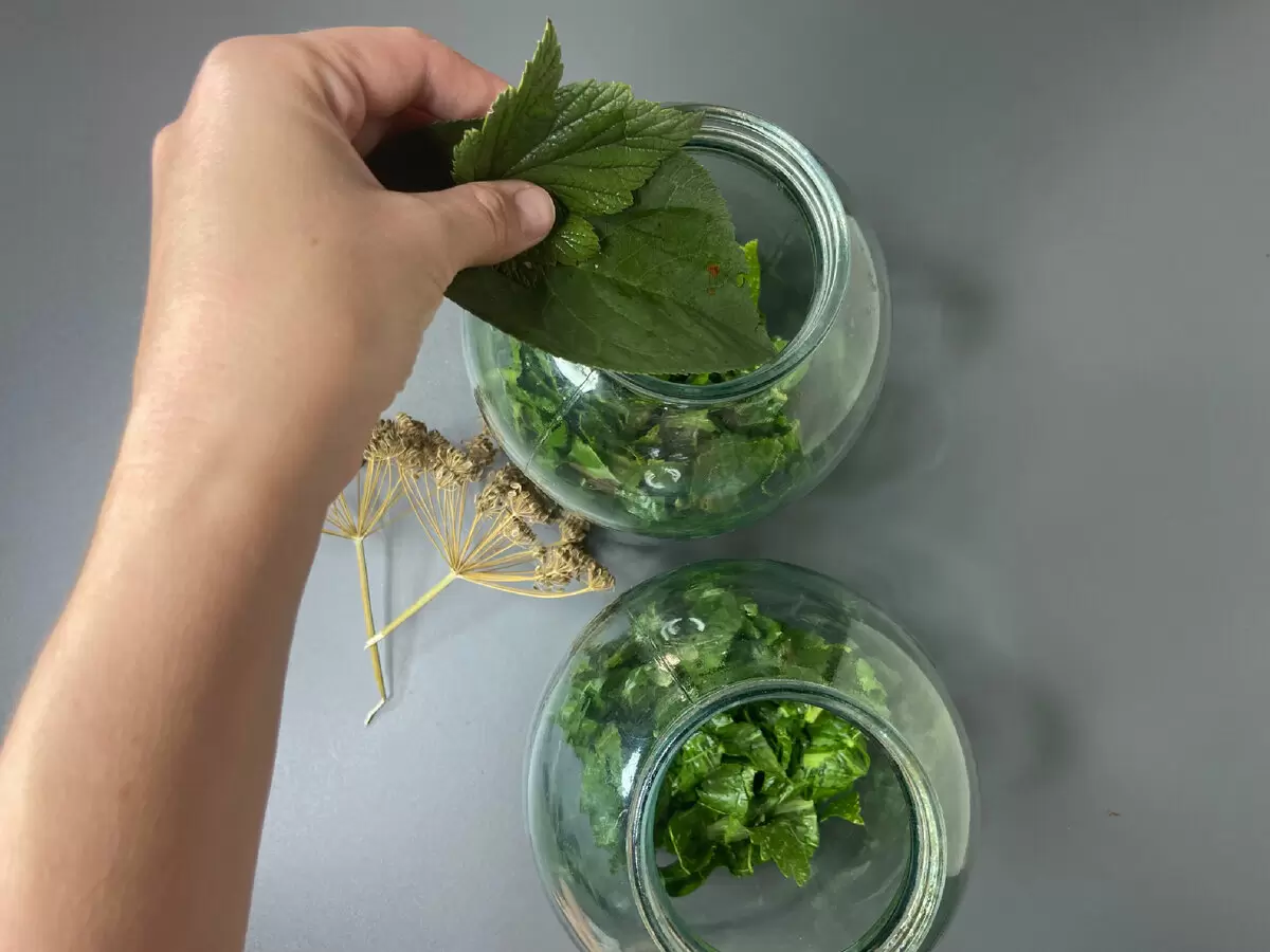 Перед началом процесса важно тщательно подготовить банки — их необходимо стерилизовать. На дно каждой банки укладывается много зелени: листья хрена, смородины, вишни и зонты укропа. Дополнительно можно добавить лавровый лист, чеснок и черный перец горошком по вкусу.