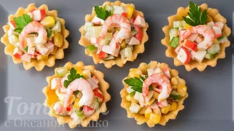 4. Наполните полученной начинкой песочные корзинки. Количество начинки хватает на 15-20 тарталеток в зависимости от их размера. Украсить каждую тарталетку можно листиком петрушки и очищенной креветкой.