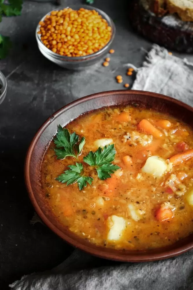 Представляем вашему вниманию аппетитный и полезный вегетарианский суп из чечевицы и картофеля с яркими добавлениями овощей и зелени.