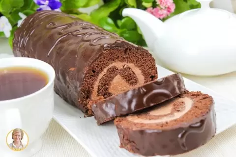После того как бисквит охладится, его нужно пропитать сиропом, а затем намазать кремом и свернуть в рулет. В завершении рулет покрывается глазурью и убирается в холодильник для застывания.