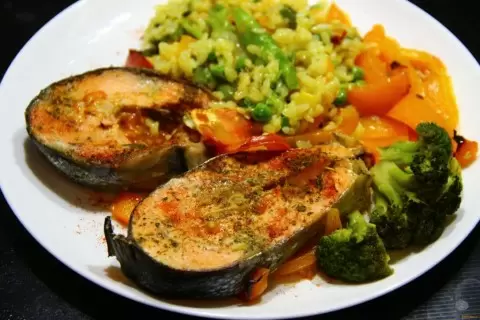 Форма для запекания должна быть достаточно большой, чтобы в неё помещались все ингредиенты. Её нужно смазать небольшим количеством масла (1 столовая ложка будет вполне достаточно). Стейки рыбы укладывают на дно, а сверху размещают нарезанные овощи. Важно не пересаливать овощи, так как рыба уже была подсолена.