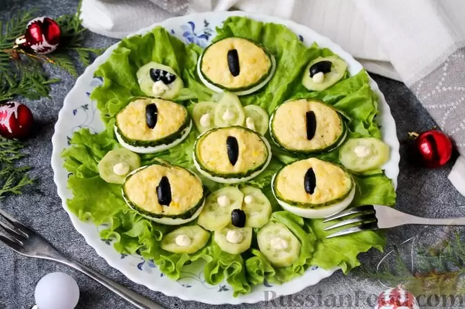 - Закуска "Глаз дракона". Этот красочный салат с крабовыми палочками и ананасами мгновенно привлечёт внимание. Мелко нарезанные ингредиенты дарят насыщенный вкус, а подача в виде отдельных порций придаст изысканности.