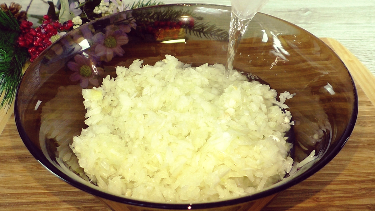 Для начала необходимо мелко нарезать лук или измельчить его с помощью блендера — важно не довести до состояния пюре. Переложите лук в глубокую миску и залейте кипятком: это поможет избавиться от горечи. Подождите 10 минут, затем промойте под холодной водой и слегка отожмите.