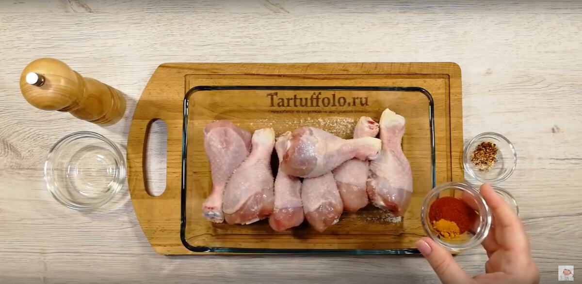 В первую очередь важно подготовить куриные ножки. Их необходимо тщательно посолить и приправить специями — красной паприкой и щепоткой куркумы. Не забудьте добавить немного острого чили перца и два зубчика чеснока, предварительно выдавленных через пресс.