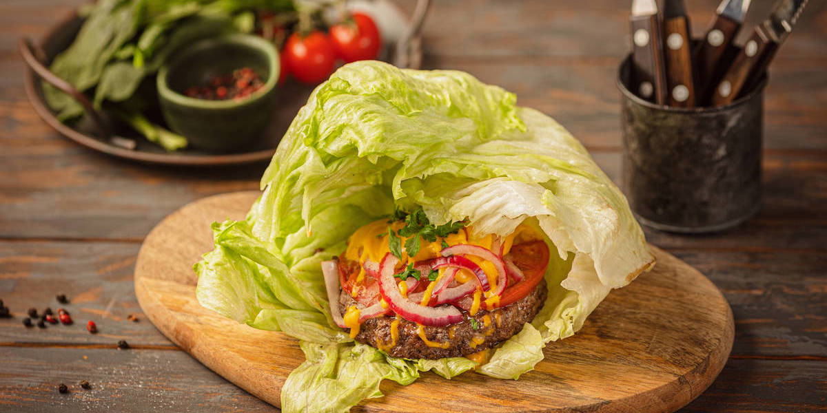 - Снижение углеводов благодаря замене булочек на листья салата делает блюдо подходящим для кето-диеты.