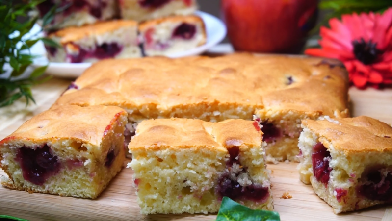 Подготовьте форму, смазывая ее маслом. Вылейте половину теста на дно формы, равномерно распределите ягоды (замороженную вишню можно не размораживать предварительно), а затем залейте оставшуюся часть теста сверху.