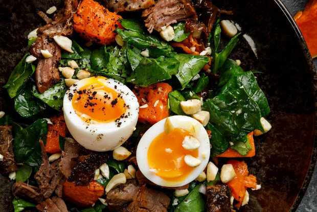 Шпинат промыть, удалить крупные стебли и порубить, после чего смешать с теплой готовой тыквой, заправить соусом унаги, оливковым маслом и лимонным соком. На блюде выложить прогретый брискет, слегка его порвать, украсить рубленым миндалем, разрезанным пополам яйцом и мелко нарезанными сушеными маслинами.