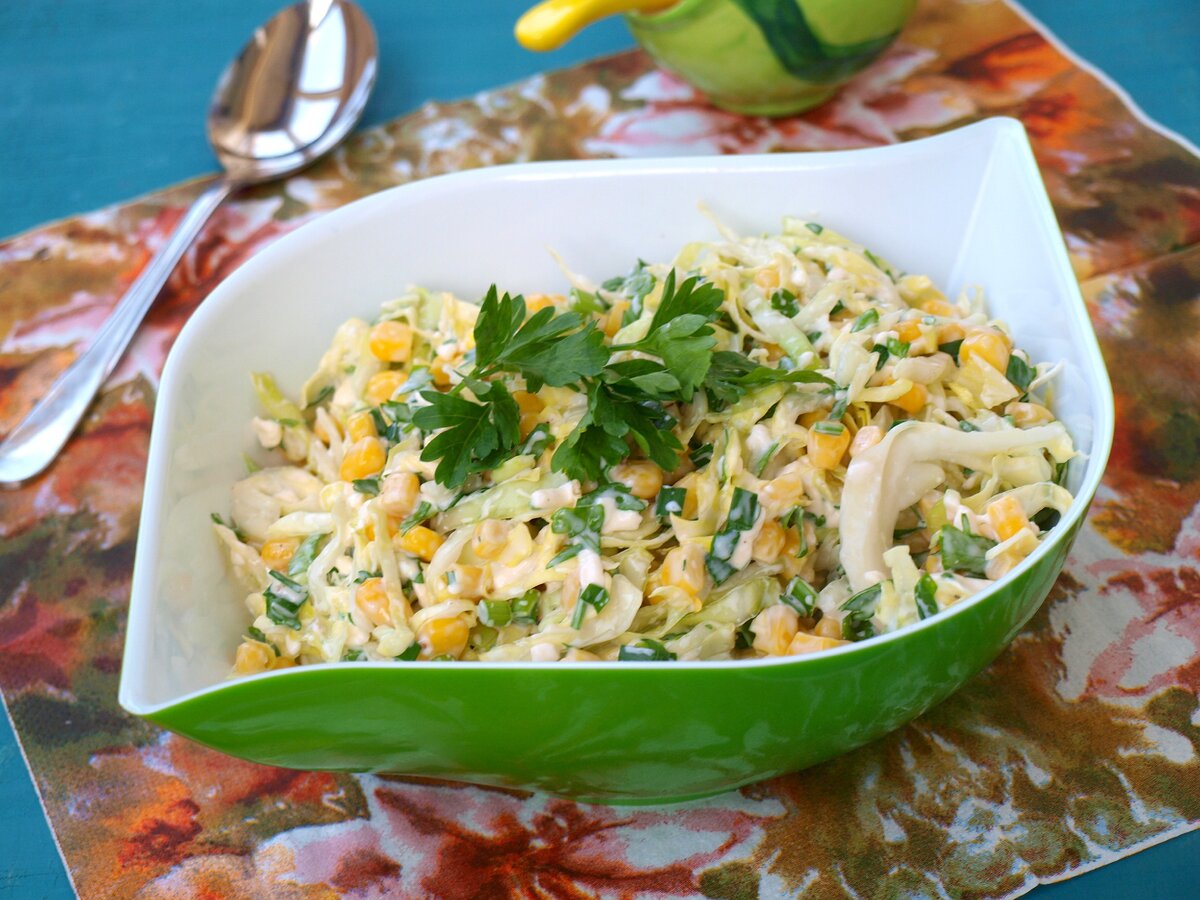 Этот салат готовится за считанные минуты. Нежно нарезанная капуста и зелень соединяются с консервированной кукурузой, приправляются солью и перцем, а также заправляются майонезом. Простота и сочетание вкусов приятно удивят всех!