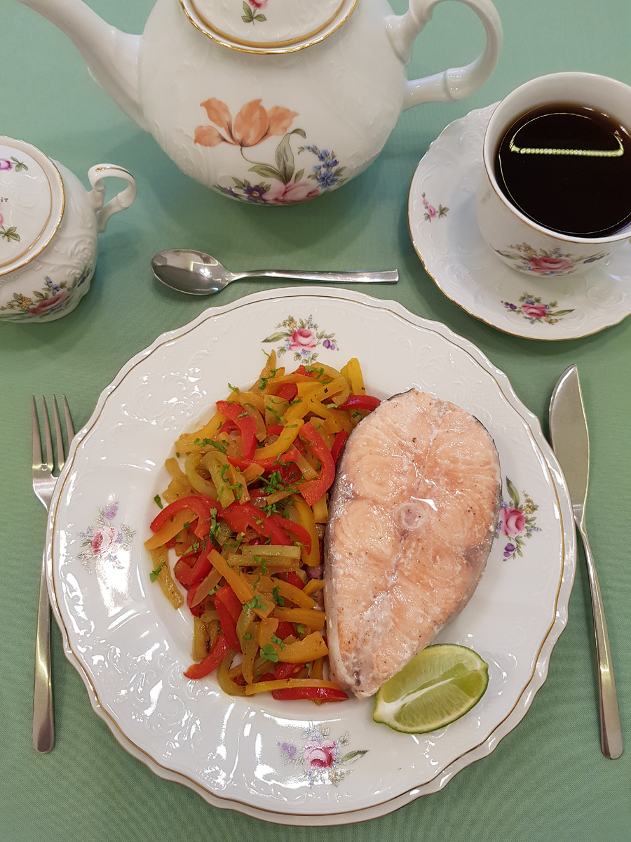 Готовую сёмгу можно подавать как в порционных тарелках, так и на большом блюде. Для особого оформления рекомендуется дополнить рыбу свежими овощами и фруктами: кусочками лайма, лимона, черри, а также зеленью и маслинами. Такое оформление не только украсит блюдо, но и подчеркнёт вкус запечённой сёмги.