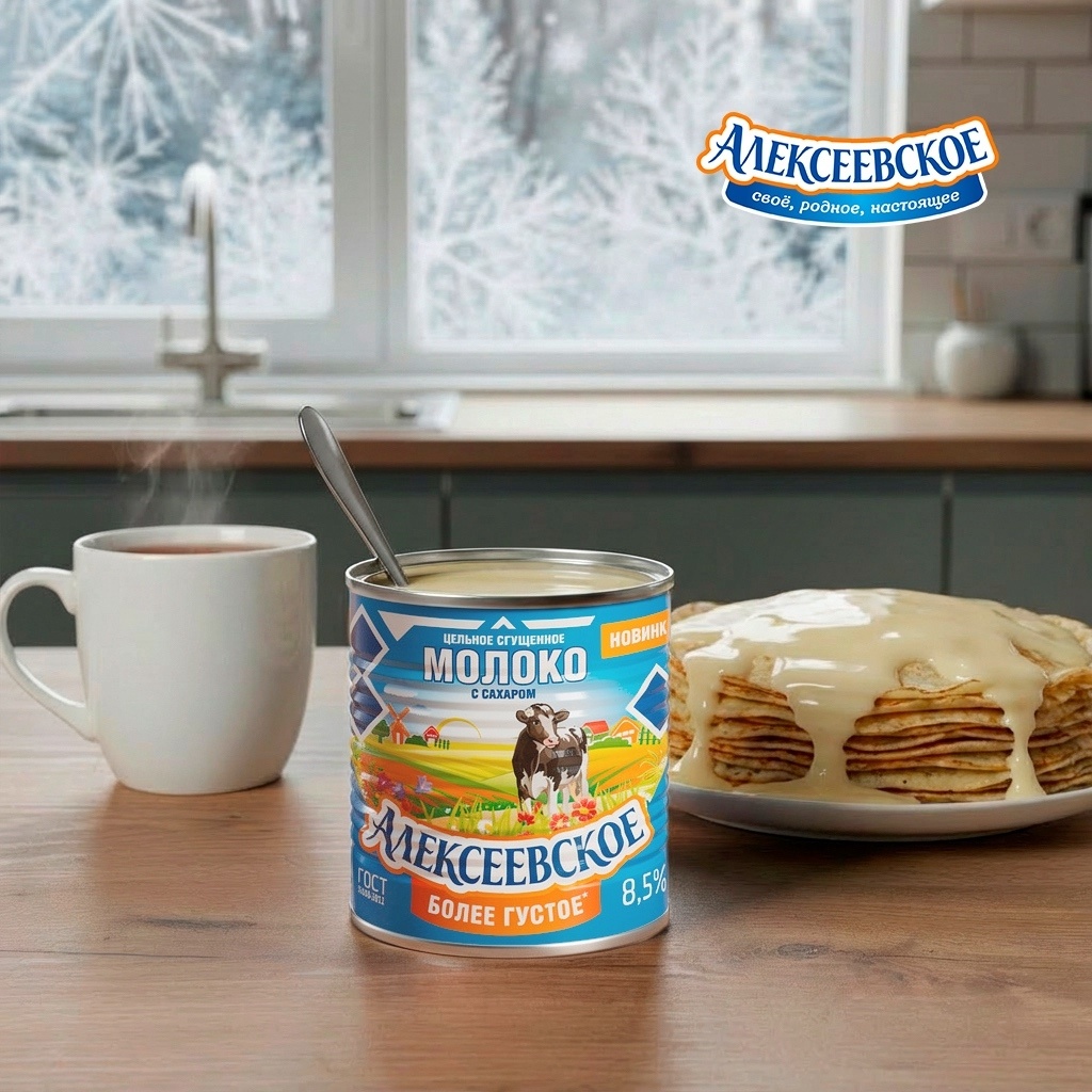 Нельзя забывать про финальный штрих — сгущённое молоко «Алексеевское». Его густая текстура и яркий сливочный вкус добавят блинам ту самую изюминку, которая сделает их по-настоящему любимыми.