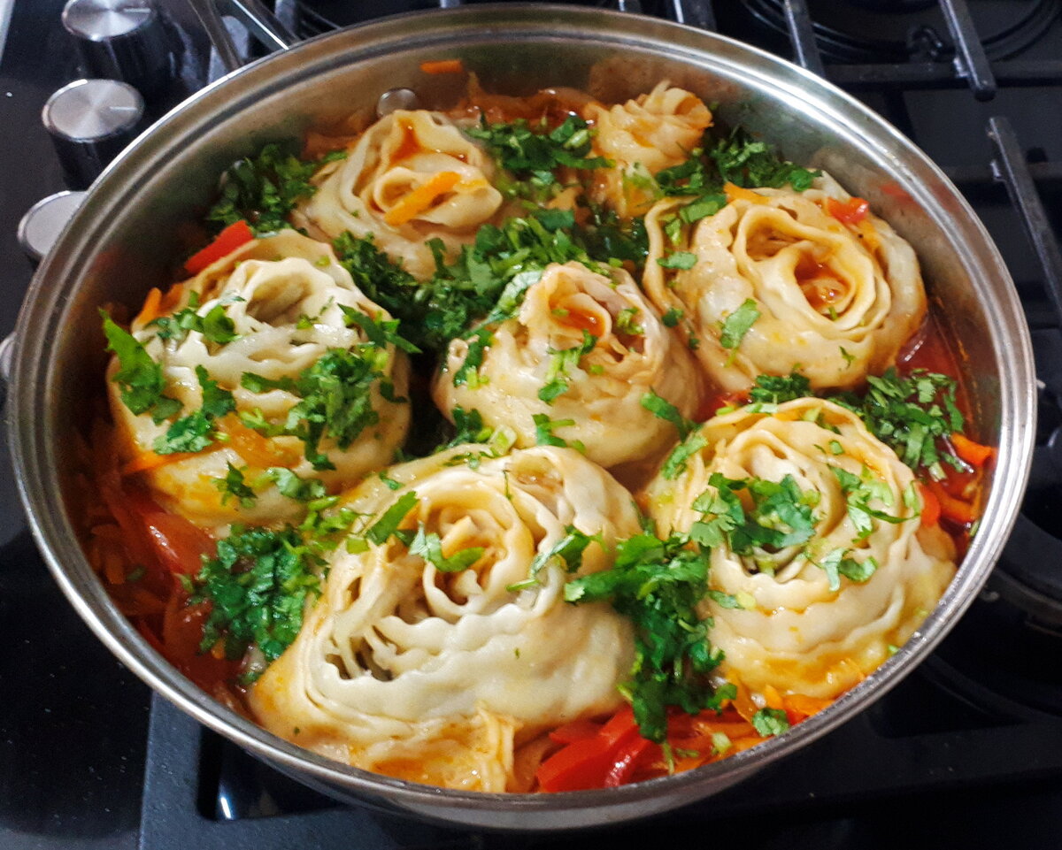 Для начала следует замешать пельменное тесто, используя 250 граммов муки, 150 миллилитров воды и немного соли. Дать тесту настояться, а за это время можно подготовить овощи: нарезать их и натереть на терке. После этого раскатать тесто в тонкий пласт и нарезать на прямоугольные полосы.
