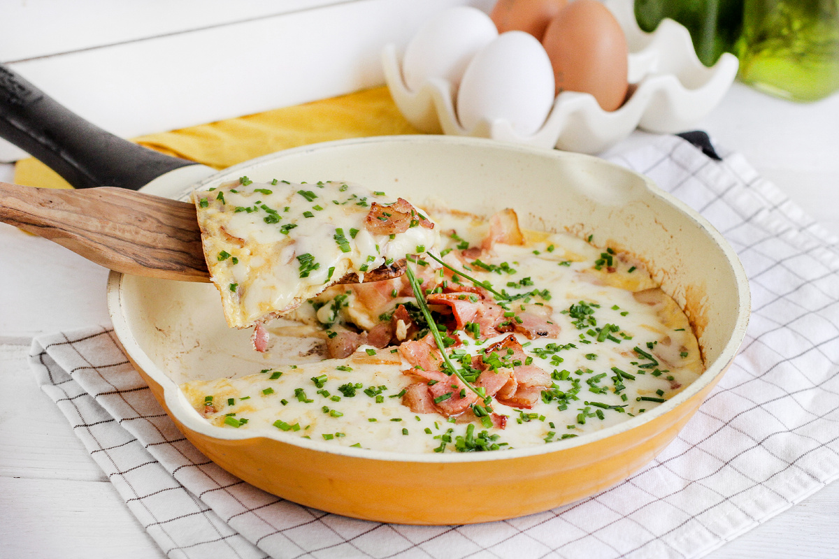 В Брюсселе на днях был приготовлен колоссальный омлет, для которого понадобилось 10 тысяч яиц, мешок лука и целых 25 литров масла! Такой массивный завтрак смог накормить 3500 человек. Наш вариант, хоть и скромнее, но не менее аппетитный. Омлет с беконом и сыром — это незабываемое начало утреннего приема пищи, которое точно поднимет настроение на весь день!