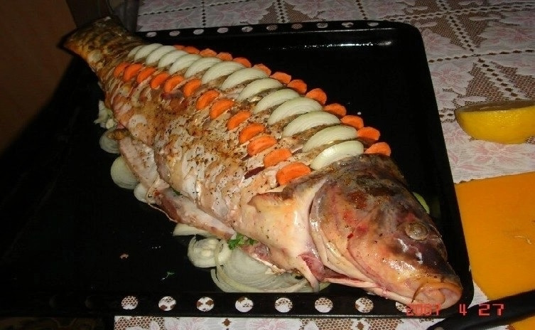 Через час и двадцать минут карп будет готов к сервировке. Не забудьте, что «вкусная» часть находится в голове!