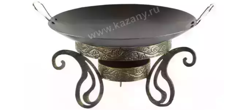 Садж оборудован двумя надежными ручками, обеспечивающими безопасность при использовании. Благодаря большому диаметру блюда можно быстро и удобно накормить как семью, так и компанию друзей. В комплект прилагается кованая вручную подставка с азербайджанским орнаментом, которая также служит резервуаром для углей или свечей, поддерживающих тепло готовых блюд.