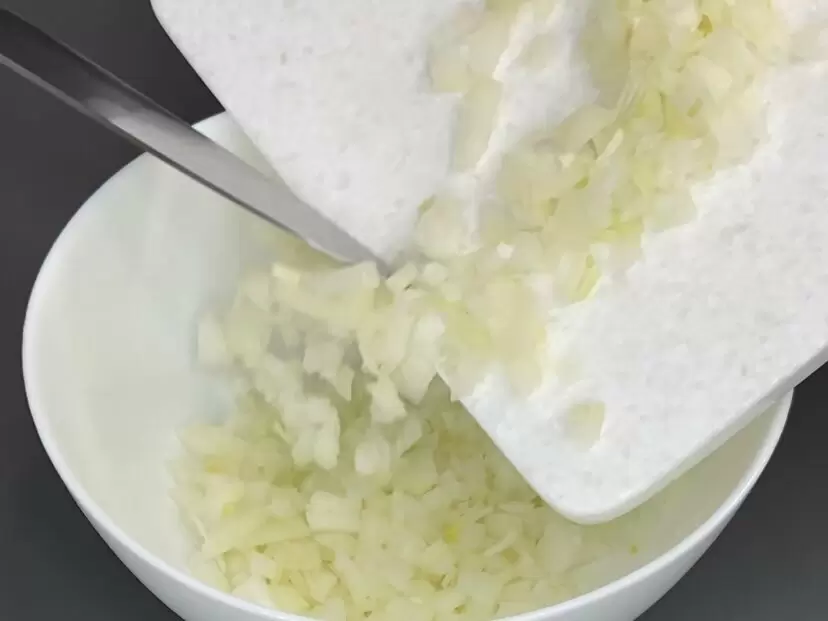 Для начала необходимо подготовить два крупных лука и нарезать их кубиками – это самый трудный шаг в нашем рецепте. Затем в миске соединяются два яйца и немного соли. Для большей сочности можно предварительно «помять» лук с солью, чтобы он дал сок, а лишь потом добавить яйца.