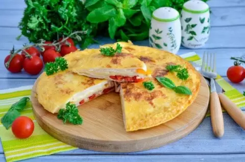 Заключительная заливка: Залейте оставшуюся яичную массу сверху и накройте крышкой. Жарьте на низком огне, пока нижняя часть не подрумянится (примерно 5-7 минут).