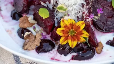 Эта яркая закуска из свеклы, вишни и сыра порадует не только глаз, но и вкус! Сочетание сладкого и кислого, нежности сыра и насыщенности овощей превращает блюдо в настоящее произведение кулинарного искусства, которое не оставит равнодушным никого.