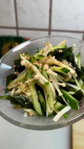 Соедините в одной миске грибы Эноки, огурец, водоросли Вакамэ и заправку, затем хорошо перемешайте. Для наилучшего эффекта оставьте закуску в холодильнике на 30 минут.