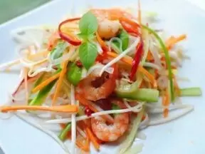Этот салат станет отличной заменой обеду или лёгкому ужину. Он готовится быстро, не требует сложных навыков и состоит в основном из свежих ингредиентов. Главной изюминкой блюда является соус Nuoc Cham — популярный вьетнамский рецепт.