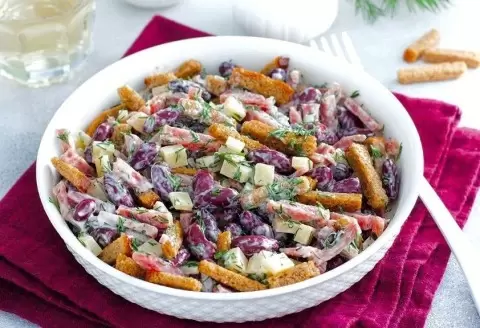 - Пикантный салат из белой фасоли: Сочетание отварной фасоли, корейской моркови и обжаренного лука — это отличный вариант для закуски. Добавление морепродуктов или копченой колбасы сделает его ещё более насыщенным.