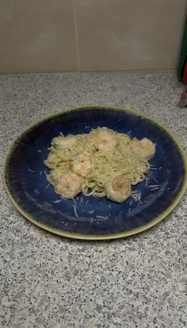 Когда креветки готовы, добавьте отваренные спагетти и аккуратно перемешайте, чтобы каждый макарон был равномерно покрыт соусом. Завершите процесс, добавив тертый пармезан, и вновь перемешайте.