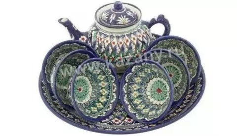 Купить этот великолепный чайный сервиз можно в надежном интернет-магазине казаны.ру. Керамика "Риштан" славится не только в Узбекском эмирате, но и за его пределами, что подтверждает высокую цену и ценность, которую она сохраняет веками. Комплект включает чайник объемом 1 л, пиалы и большое блюдо диаметром 34 см, на которое можно подавать разнообразные угощения — от восточной выпечки до современных кулинарных шедевров.